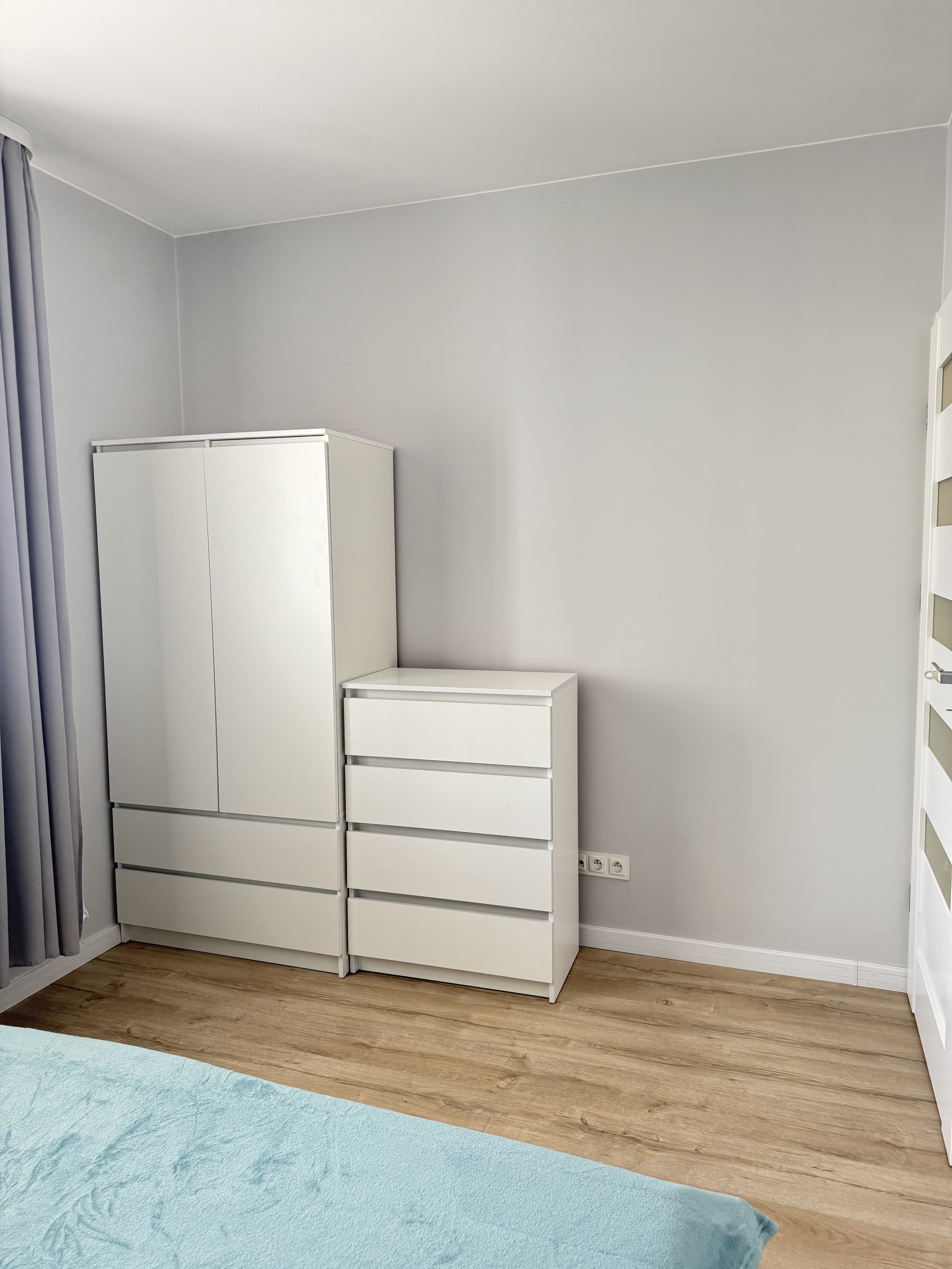 - Przytulna sypialnia: duże podwójne łóżko, szafa i komoda